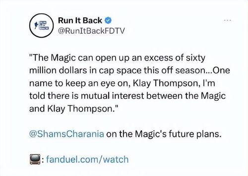 最近篮球圈可是炸开了锅!听说克莱·汤普森要离开金州勇士队,加盟华盛顿奇才队?这消息一出,球迷们纷纷议论纷纷,有的激动不已,有的惋惜不已。那么,这个消息究竟是不是真的呢?今天,我们就来一探究竟,看看克莱·汤普森是否真的去了魔术队。